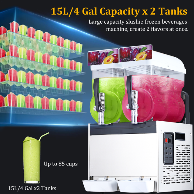 Dual 15L/3.9-Gallon Capacity: This commercial slushie machine caters to various beverages, from smoothies to iced coffee and frozen cocktails, ideal for quenching thirst in the summer heat. With two 15L/3.9-gallon tanks, each batch produces 100 servings of delightful slushies, making this margarita machine a vibrant addition to any environment.