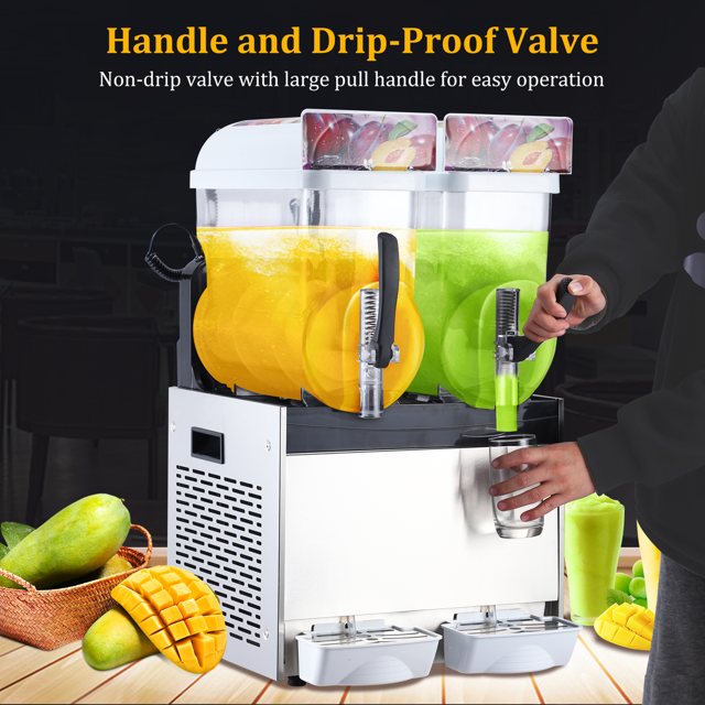 Our commercial 2-tank slush frozen drink machine offers refreshing beverages, perfect for cooling off on hot summer days. Constructed with durable stainless steel and PC materials, featuring efficient cooling capabilities, precise controls, and user-friendly design, this slushie machine is a must-have for bars, camping trips, and family events.